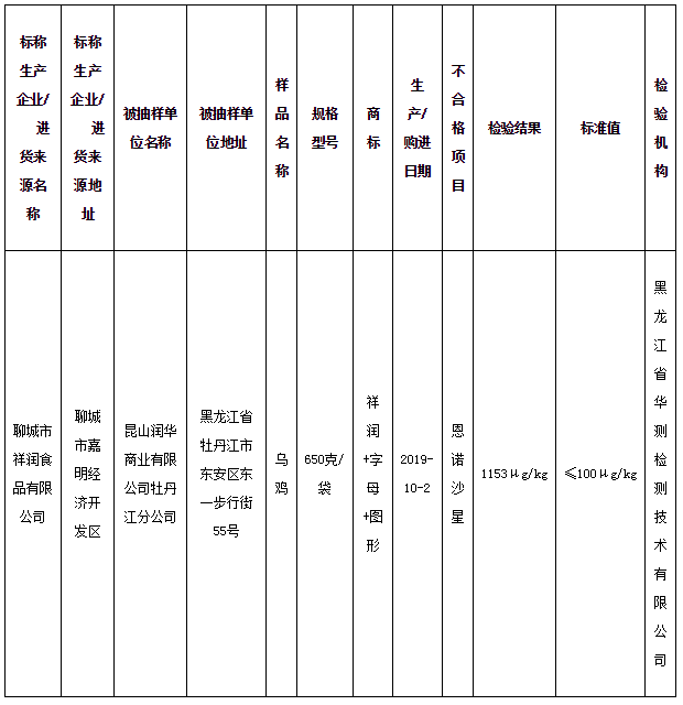 信息顯示,昆山潤華商業有限公司牡丹江分公司銷售的標稱聊城市祥潤食品有限公司生產的烏雞(生產日期2019年10月2日),被檢出恩諾沙星不符合食品安全國家標準規定。檢驗機構為黑龍江省華測檢測技術有限公司。
