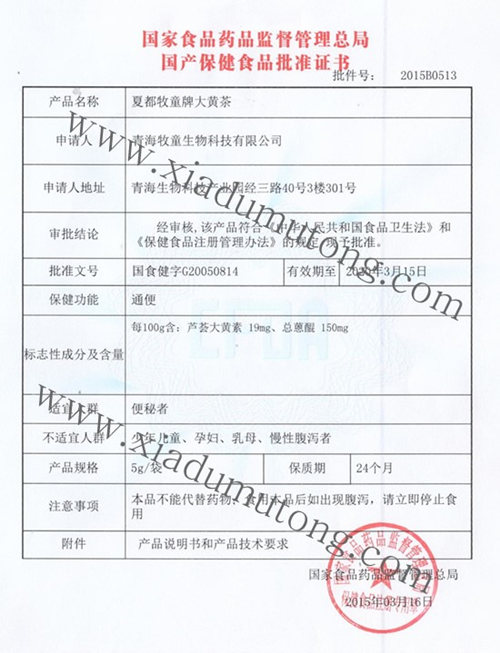 青海夏都牧童牌大黃茶是由原國(guó)家食品藥品監(jiān)督管理局批準(zhǔn)的國(guó)食健字號(hào)產(chǎn)品。