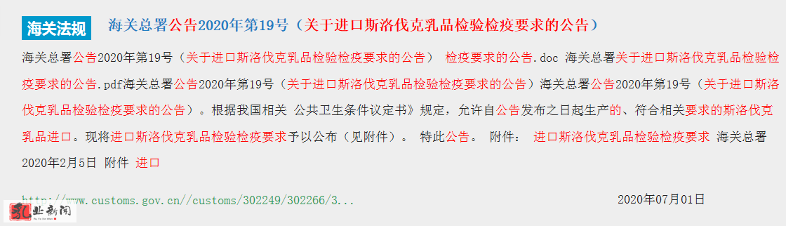 今年7月1日,海關總署官網分別發布關于進口斯洛伐克乳品、哈薩克斯坦乳品檢疫檢驗要求的公告,允許自公告發布之日起生產的、符合相關要求的斯洛伐克乳品進口,允許符合相關要求的哈薩克斯坦乳品進口。