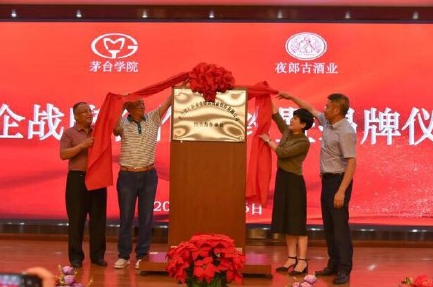 由仁懷市市委常委、統(tǒng)戰(zhàn)部部長程雯、遵義市仁懷市酒協(xié)會長呂玉華,茅臺學(xué)院黨委副書記、常務(wù)副校長李增馳,夜郎古公司董事長余方強共同為“夜郎古酒業(yè)股份有限公司校企合作單位”揭牌。