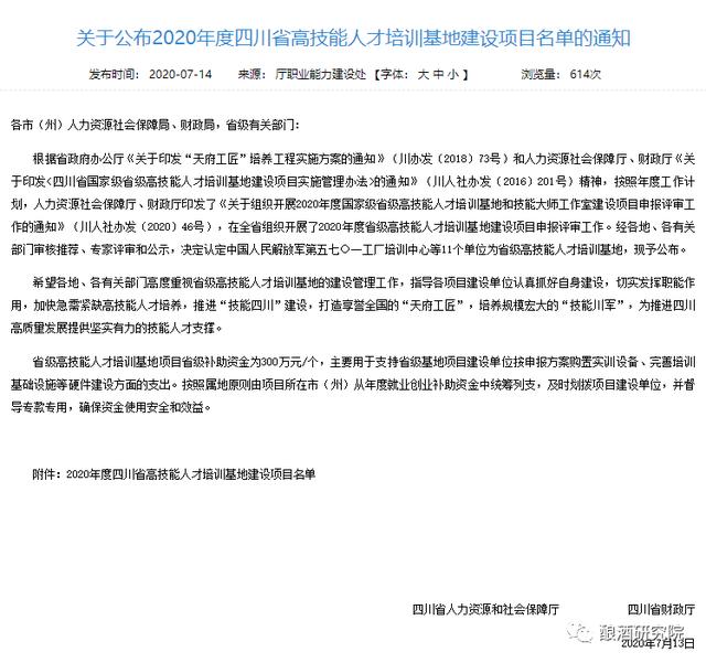 中國食品網訊 據四川省人社廳7月14日消息,經四川省人力資源和社會保障廳、四川省財政廳認定,四川省食品發酵工業研究設計院等11家單位為“四川省高技能人才培訓基地”。