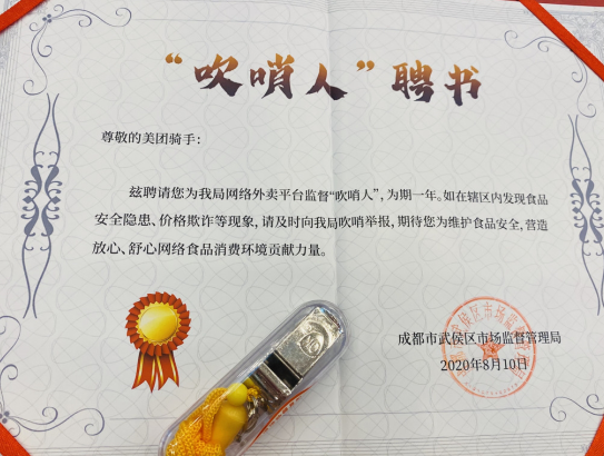 作為承擔此次政企合作試點任務的單位,簽約儀式上,武侯區市場監督管理局黨組書記、局長王佳舟代表武侯區市場監督管理局發布了《“騎手”食品安全監督員“吹哨人”計劃》,現場為餓了么和美團的騎手代表頒發了“吹哨人”聘書,并附贈“口哨”。