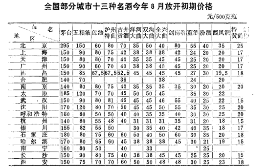 1986-1988年,釀酒原料、燃料價格持續上漲,部分酒廠由盈利轉為虧損,有的地方自行提高白酒價格。1988年,為了調節供求,引導消費,節約糧食,增加國家財政收入,國家發布《關于放開名酒價格和適當提高其他糧食釀酒價格的通知》、《關于名煙名酒放開價格和部分煙酒調整價格后征收產品稅、專項收入問題的規定》,放開13種名煙,13種名酒價格和適當提高部分高中檔卷煙和糧食釀酒的價格。酒在提價的同時提高產品稅稅率5%,酒的提價收入征收糧食白酒35%,并按國優酒30%、省部優酒25%征收專項收入。由于產量較小,4名優酒供不應求,茅臺、五糧液、郎酒、瀘州特曲的零售價格分別是原來的6-10倍。譬如,茅臺酒零售價產地每瓶由20元漲到120元,銷售地漲到150元,最高的漲到290元。此時,一斤裝的文君酒零售價為10.48元/瓶。