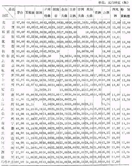1989年,由于國家壓縮消費基金,特別是控制集團消費,禁止公費吃喝。買方市場取代賣方市場,一線名酒銷售遇阻,價格紛紛下降。譬如,到1990年,上海茅臺零售價由1988年的150元降至90元,五糧液由90元降至48元,郎酒由80元降至42.5元,瀘州特曲由75元降至32元,劍南春由42元降至25元,洋河大曲、雙溝大曲由38元降至24元,全興大曲由38元降至20元,古井貢酒由42元降至17元,董酒由24元降至20元,汾酒由20元降至18元,西鳳酒由20元降至16元,特制黃鶴樓酒由17元降至16元。