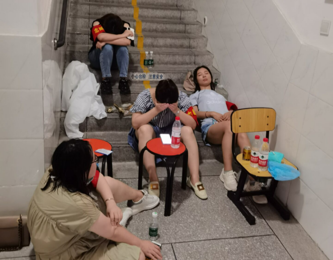 在這樣酷暑的天氣,所有參與的志愿者都是在硬撐著,汗水把衣服打濕了一遍又一遍,實在濕的厲害的,脫下來擰干后,穿上又開始工作。大家都不同程度出現了心慌、手腳發抖、頭暈頭疼、惡心想吐的中暑癥狀,但是大家都在堅持,實在累了就坐在地上休息一小會兒,從早到晚,他們持續工作了18個小時,直到凌晨兩點,接替的志愿者到來,他們才紛紛回家休息。