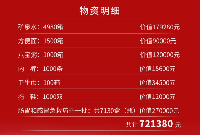 仁懷茅臺鎮遠明酒業集團緊急籌備了4980箱礦泉水、1500箱方便面等70余萬應急物資,用于保障受災群眾的基本生活和醫療救助。據悉,這批捐贈物資已于7月27日抵達河南周口。