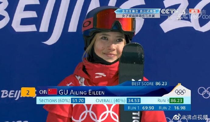 個人第二塊獎牌!今日,谷愛凌在北京冬奧會女子自由式滑雪坡面障礙技巧決賽中,頂住壓力,奪得一枚銀牌。7天前,她以轉體1620度女子最高難度動作,獲得自由式滑雪女子大跳臺冠軍,創造了中國冰雪歷史。
