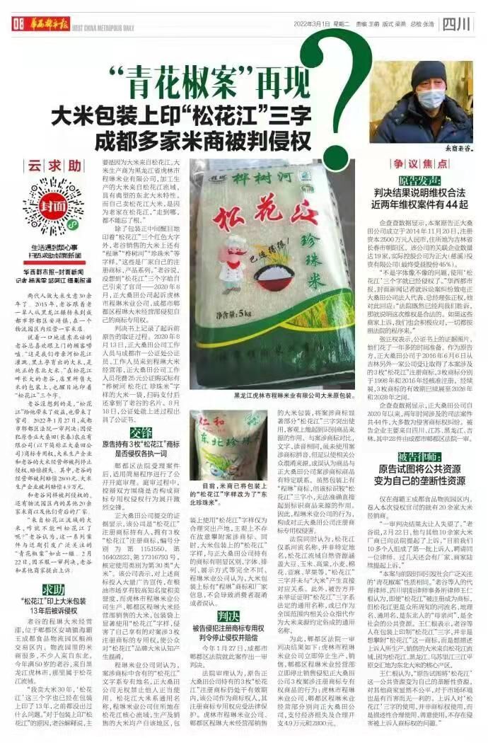 原標題:“青花椒案”再現?大米包裝上印“松花江” 四川成都多家米商被判侵權