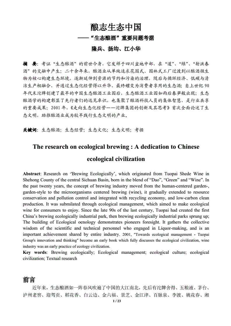 關鍵詞:生態釀酒;生態經營;生態文化;生態文明;考據