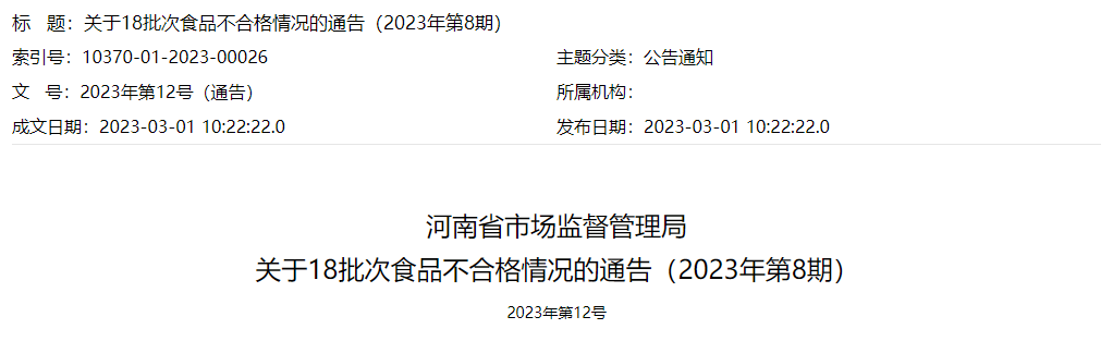 近日,從河南省市場監督管理局關于18批次食品不合格情況的通告(2023年第8期)獲悉,市場監管局抽檢餐飲食品,茶葉及相關制品,炒貨食品及堅果制品,淀粉及淀粉制品,豆制品,方便食品,糕點,食品添加劑,食用農產品,食用油、油脂及其制品,速凍食品,飲料,糖果制品,保健食品14大類食品638批次樣品。其中合格樣品620批次,不合格樣品18批次。
