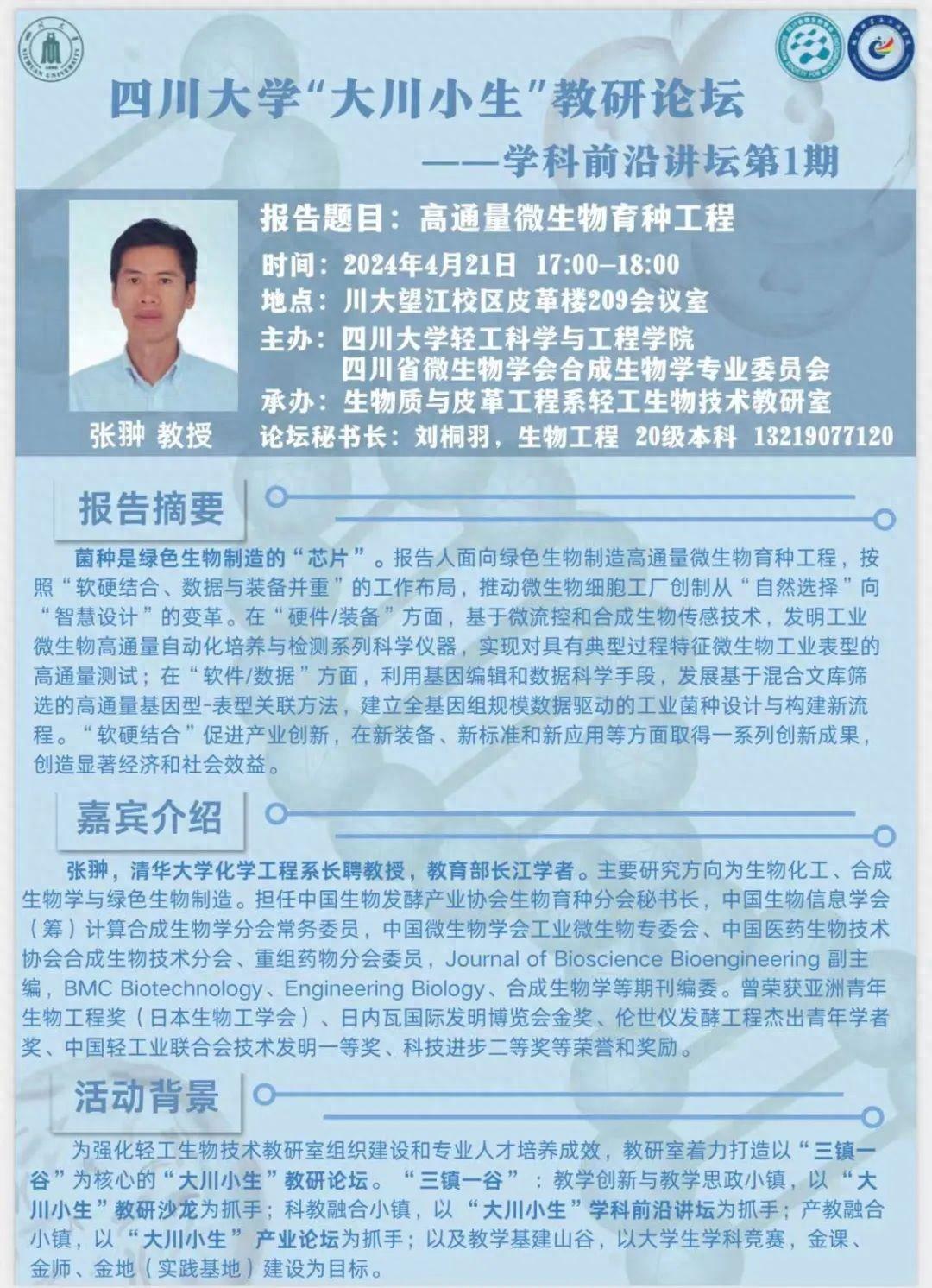 聚焦新科技革命背景下生物工程專業本科人才培養體系的迭代升級,4月21日,由四川大學輕工科學與工程學院、四川省微生物學會合成生物學專委會主辦的四川大學“大川小生”教研論壇將在四川大學望江校區皮革樓209會議室舉辦。這也是“三鎮一谷”為核心的 “大川小生”教研走廊系列活動。