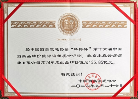 “華樽杯”被業內譽為“中國酒類奧運會”和“中國酒行業的晴雨表”,經組委會評測,本真醬酒(北京本真醬酒酒業有限公司)2024年度品牌價值為135.85億元,位列中國白酒品牌價值第74名。