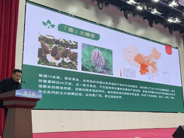 四川金地田嶺澗生物科技有限公司總經理何金龍作“羊肚菌菌種經營服務新模式及產品營銷”的分享,側重介紹了公司的技術優勢及服務模式。