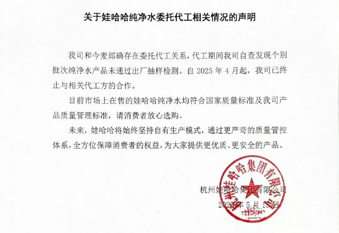 網友發現購買的娃哈哈純凈水瓶身標注“今麥郎生產”,引發對品牌品質的質疑。娃哈哈隨后聲明承認代工關系,但強調因“自查發現個別批次產品未通過出廠抽樣檢測”,自4月起已終止合作,并表態未來堅持自有生產。此舉將今麥郎置于質量問題的風口浪尖,引發網友對娃哈哈“拉踩”行為的爭議。