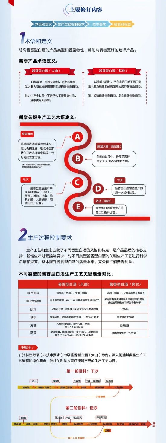 與現行GB/T 26760-2011《醬香型白酒》相比,新標準GB/T10781.4-2024對醬香型白酒的標準進行多項修改,包括標準名稱、醬香型白酒定義、產品分類、產品分級、生產過程要求、感官要求、理化要求、衛生指標、附錄等。