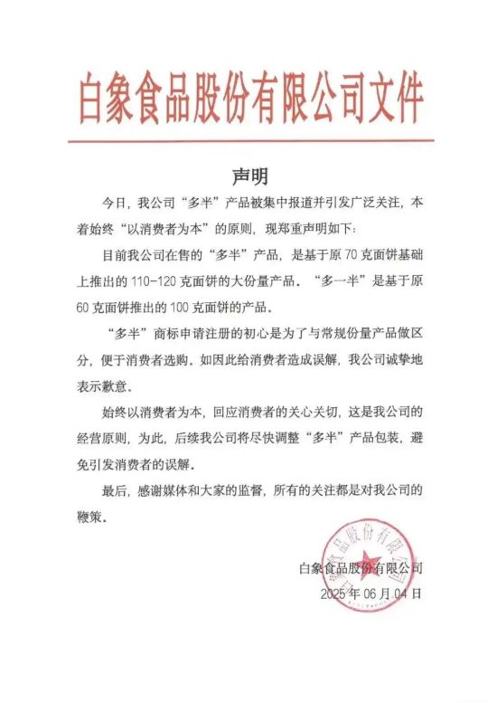 今日,我公司“多半”產(chǎn)品被集中報道并引發(fā)廣泛關注,本著始終“以消費者為本”的原則,現(xiàn)鄭重聲明如下:目前我公司在售的“多半”產(chǎn)品,是基于原70克面餅基礎上推出的110-120克面餅的大份量產(chǎn)品。“多一半”是基于原60克面餅推出的100克面餅的產(chǎn)品。“多半”商標申請注冊的初心是為了與常規(guī)份量產(chǎn)品做區(qū)分,便于消費者選購。如因此給消費者造成誤解,我公司誠摯地表示歉意。始終以消費者為本,回應消費者的關心關切,這是我公司的經(jīng)營原則,為此,后續(xù)我公司將盡快調(diào)整“多半”產(chǎn)品包裝,避免引發(fā)消費者的誤解。最后,感謝媒體和大家的監(jiān)督,所有的關注都是對我公司的鞭策。