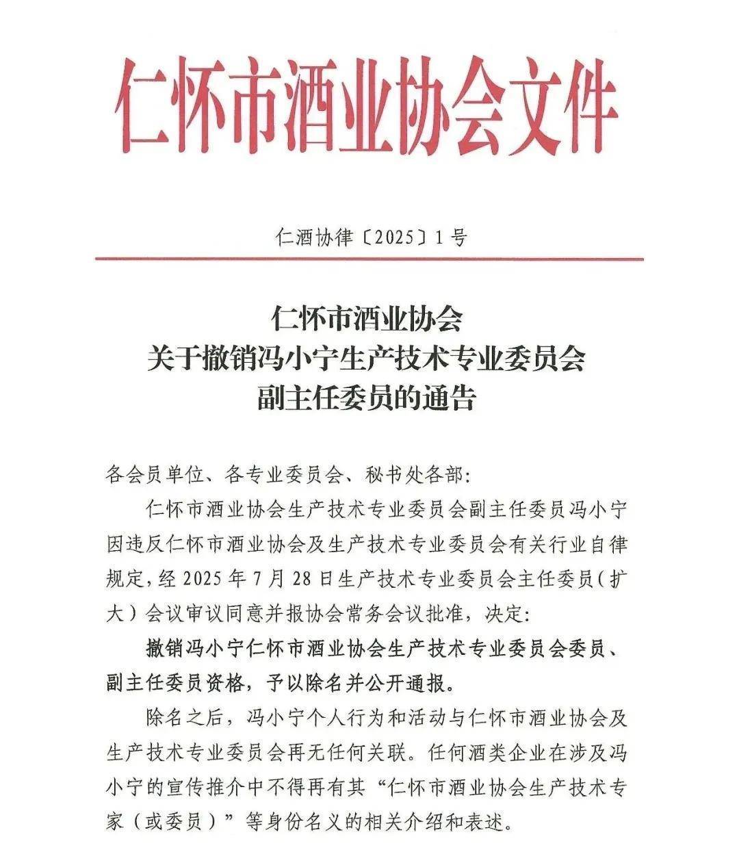 通告中顯示,仁懷市酒業協會生產技術專業委員會副主任委員馮小寧因違反仁懷市酒業協會及生產技術專業委員會有關行業自律規定,經2025年7月28日生產技術專業委員會主任委員(擴大)會議審議同意并報協會常務會議批準,決定:撤銷馮小寧仁懷市酒業協會生產技術專業委員會委員、副主任委員資格,予以除名并公開通報。