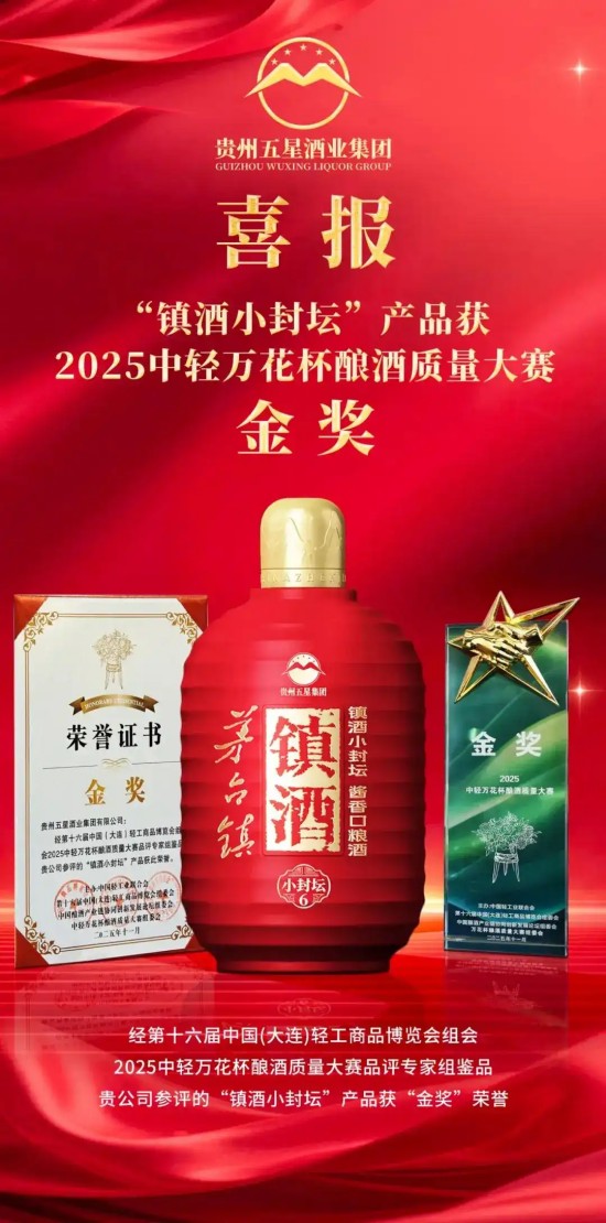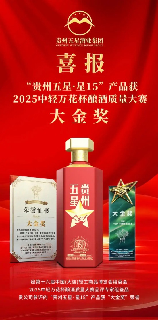 在本屆博覽會首次舉辦的2025中輕萬花杯釀酒質量大賽中,貴州五星酒業(yè)集團有限公司旗下產品“貴州五星?星15”、“鎮(zhèn)酒小封壇”憑借卓越品質與厚重文化,分別斬獲“大金獎”“金獎”兩大獎項。