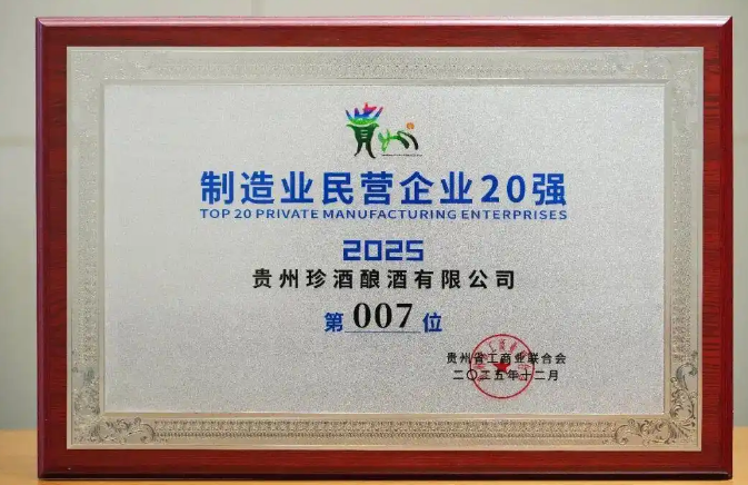 12月24日,貴州省工商業(yè)聯(lián)合會在貴陽召開2025年貴州民營企業(yè)100強發(fā)布會,發(fā)布“2025貴州民營企業(yè)100強榜單”和“貴州制造業(yè)民營企業(yè)20強”榜單。貴州珍酒以強勁綜合實力,位列貴州民營企業(yè)100強第10位、貴州制造業(yè)民營企業(yè)20強第7位,蟬聯(lián)貴州民營酒企第一。