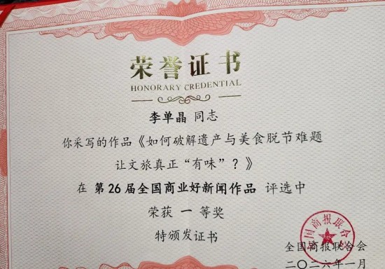 編者按:近日來自全國商報聯(lián)合會的消息,由《餐飲世界》推薦的成都市社會科學院李單晶博士等采寫的作品《如何破解遺產(chǎn)與美食脫節(jié)難題 讓文旅真正“有味”?》在第26 屆全國商業(yè)好新聞作品評選中榮獲一等獎,特頒發(fā)證書。現(xiàn)將原文發(fā)表于后,以饗讀者。